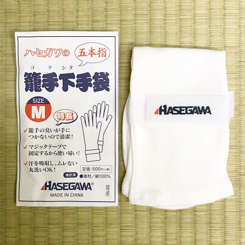 These 5-finger Hasegawa gloves are designed to be worn under kote and feature an adjustable Velcro strap at the wrist. Available sizes are Small, Medium, Large, and X-Large. The white version has been discontinued and will not be restocked.