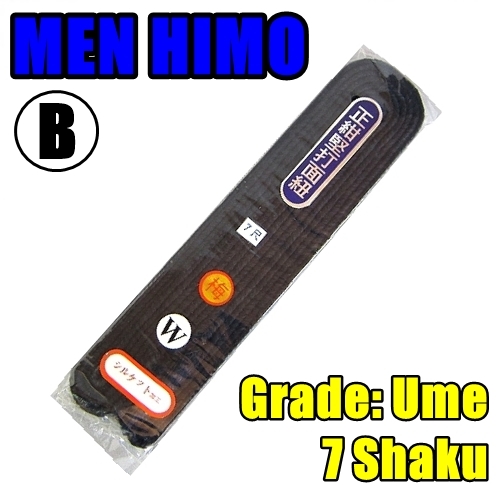 The KENDO Men Himo Replacement features standard to high-quality navy men himo made from 100% cotton. Each set includes two strings and is available in three grades: SHO (Pine – highest), CHIKU (Bamboo), and BAI (Plum – basic). Length options include 7 shaku (212 cm) as the standard and 8 shaku (242 cm) as the longest.