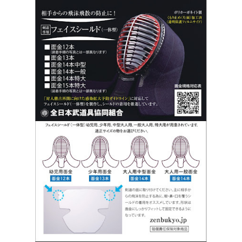 Crafted from durable polycarbonate, this full face shield features an anti-fog design and is compatible with mengane sizes 12 to 15. Available in Youth, Standard, and X-Large sizes. Certified by the Zen Nihon Budogu.